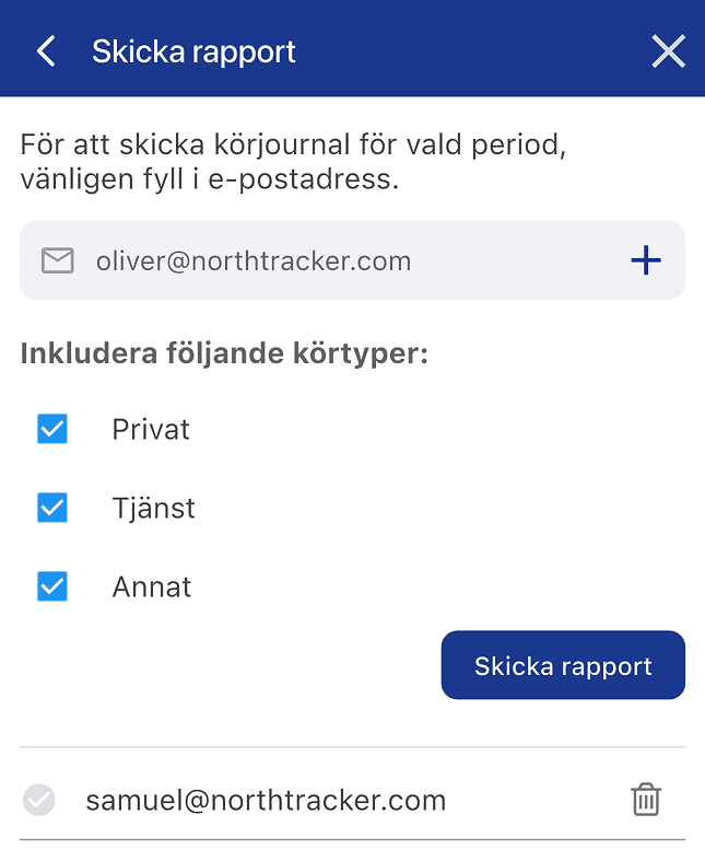 Om ditt företag har flera bilar i samma system kan ni välja att få ut en sammanfattningsrapport för bilarnas resor. Du hittar samtliga rapporter under fliken "Körjournal".