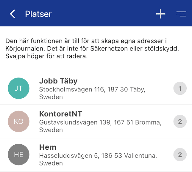 Jos matkustat säännöllisesti samaan paikkaan, voit opettaa järjestelmän tunnistamaan sijainnin ja siten vähentää manuaalista käsittelyä ajopäiväkirjaraportissa.