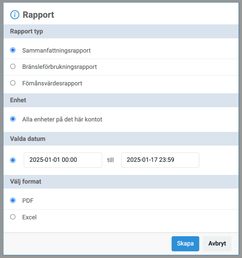 Om ditt företag har flera bilar i samma system kan ni välja att få ut en sammanfattningsrapport för bilarnas resor. Du hittar samtliga rapporter under fliken "Körjournal".
