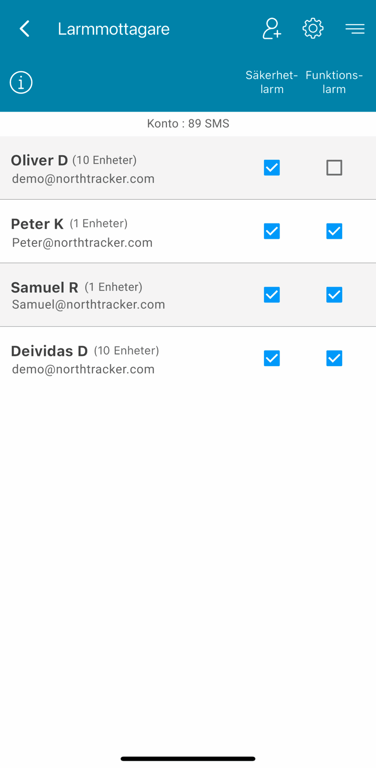 Skapa fler larmmottagare så att larmet går ut till fler personer. Du kan lägga till både användare på kontot och personer som inte finns på kontot – fyll bara i e-postadress och telefonnummer.